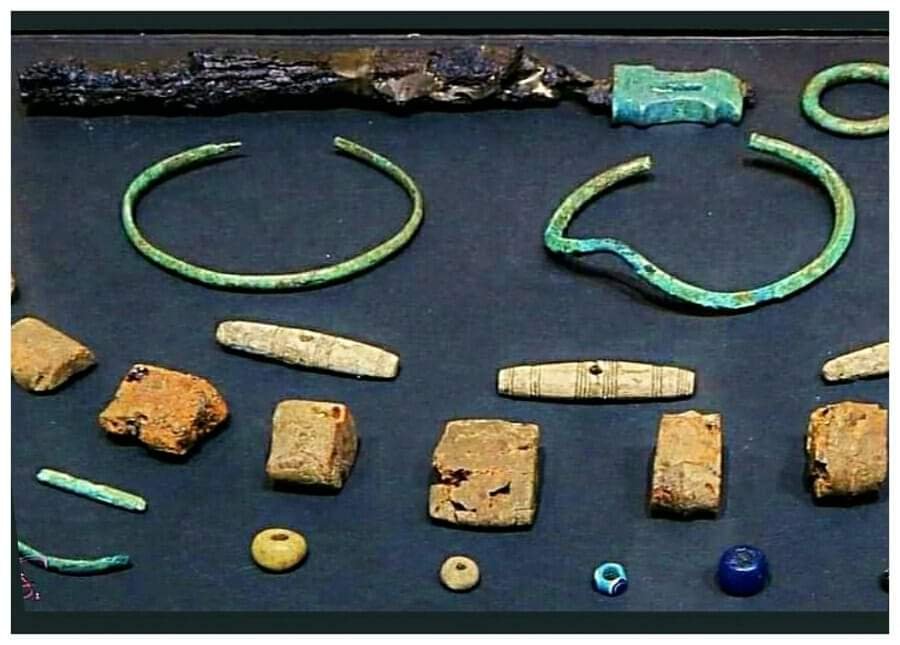Stiletto in ferro con manico in steatite, bracciali e anelli in bronzo, vaghi d’ ambra, di vetro e d’osso.