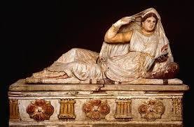 La causa della morte non è stata determinata dallo scheletro, ma probabilmente sarebbe stata considerata abbastanza anziana. La sua infanzia sembra essere stata sana. L’analisi ha rivelato che Seianti aveva cosce particolarmente forti: le ossa del femore erano robuste e i trocanteri, le aree a cui si attaccano i muscoli, erano anche prominenti, suggerendo muscoli ben sviluppati. Anche le ossa del braccio superiore erano robuste. L’interpretazione plausibile è che Seianti sia cresciuta come appassionata cavallerizza e le sue gambe si sono rafforzate stringendo il cavallo. Possiamo immaginare che fosse qualcosa che amava fare, e come un passatempo che indicava il suo status sociale agiato, abbastanza benestante da avere un cavallo da cavalcare e il tempo per farlo. Infatti, l’equitazione e le corse dei cavalli erano passioni particolari nella società etrusca. Secondo lo storico romano Livio, uno dei primi re romani intorno al 600 a.C., l’etrusco Tarquinio Prisco, costruì il primo circo a Roma e importò gli sport della boxe e delle corse dei La profonda analisi dei denti e della mandibola di Seianti eseguita da John Lilley suggerisce che il suo viso avrebbe avuto un aspetto leggermente storto, che è diventato più evidente con l’età, causato da una mandibola asimmetrica. Anche se questo potrebbe essere stato causato alla fine dall’incidente di cui si suppone, potrebbe anche essere stato un’anomalia dello sviluppo o forse causato da una condizione successiva. La sua mandibola sembra avere avuto solo movimenti limitati; sicuramente più tardi nella vita, potrebbe aver potuto mangiare solo cibi morbidi o zuppe e liquidi. Potrebbe aver protratto la mandibola per conforto e, durante il movimento, poteva emettere suoni di clic e grattamento udibili; Lilley fa notare che potrebbe aver parlato tra i denti per limitare un movimento doloroso. Inoltre, sembra che Seianti avesse una grave malattia gengivale, parodontite, che porta a “perdita di supporto dei denti, gengive doloranti e suppurazione dalle fessure ai margini dei denti”. Potrebbe essere diventato troppo doloroso tenere pulita la bocca, peggiorando così la malattia gengivale. Molto probabilmente, Seianti soffriva di alito cattivo. In ogni caso, aveva una serie di problemi dentali e Lilley conclude che avrebbe sofferto di “dolore orale cronico, apertura limitata della bocca, scarsa igiene orale e perdita ripetuta dei denti”. L’esame dettagliato dei resti di Seianti ci offre parte della sua biografia. Ma possiamo collocare Seianti in un contesto più ampio? Cosa sapevano o pensavano gli antichi popoli degli Etruschi e delle donne etrusche? Gli Etruschi erano noti ai non etruschi da molto tempo; il poeta greco Esiodo menzionò “i famosi Tirseni, molto lontani” nella sua Teogonia, composta intorno al 700 a.C. L’antico storico greco Erodoto scrisse della tradizione secondo cui si erano trasferiti in Italia dall’Anatolia, e i poeti romani talvolta li chiamavano Lidii, il nome di un popolo anatolico. Dionisio di Alicarnasso, tuttavia, intorno all’epoca di Augusto, pensava che fossero un popolo italiano autoctono. Evidentemente, esistevano diverse tradizioni e opinioni sugli Etruschi anche allora, e ciò non era unico per loro. Perché nessuna letteratura o storia etrusca è sopravvissuta e il popolo etrusco è alla fine caduto sotto l’influenza di una Roma sempre più potente, questo “guardare” gli Etruschi dall’esterno è stato normalizzato, e certamente contribuisce al “mistero” che li circonda. Spesso vediamo gli Etruschi attraverso i pregiudizi degli scrittori greci e romani; gli scrittori romani hanno sviluppato e sottolineato idee di romanità contrastando le tradizioni romane con le tradizioni degli “altri”, inclusi i loro vicini. Come suggerito da Maria Beatrice Bittarello, “le rappresentazioni romane dei popoli stranieri spesso rivelano la necessità impellente di giustificare attacchi contro di loro, e presentano costantemente Roma come detentrice dei valori culturali e religiosi ‘corretti'”. Anche le donne etrusche sono state ricostruite dagli autori classici dall’esterno – doppiamente estraniate dagli autori classici romani in termini di cultura e genere. Come evidenziato da Vedia Izzet, spicca un antico testo; si tratta di una descrizione delle donne etrusche trovata nei Deipnosophistae di Ateneo (‘Dotti intorno al tavolo da pranzo’), scritta intorno al 200 d.C., ma tratta dall’opera del IV secolo a.C. di Teopompo. Dice così: “È una legge tra gli Etruschi che tutte le loro donne debbano essere in comune: e le donne prestano la massima attenzione alla loro persona e spesso praticano esercizi ginnici, nude, tra gli uomini, e talvolta tra di loro; perché non è considerato vergognoso per loro essere viste nude. E non cenano con i loro mariti, ma con chiunque sia presente; e brindano a chi vogliono nei loro calici: e amano incredibilmente bere e sono molto belle. E gli Etruschi allevano tutti i bambini che nascono, senza che nessuno sappia a quale padre appartiene ciascun bambino: e i bambini, vivono anche loro allo stesso modo di quelli che li hanno cresciuti, avendo frequenti banchetti e frequentando tutte le donne. Né tra gli Etruschi è considerato affatto disonorevole fare o subire qualcosa all’aperto o essere visti mentre accade; poiché questo è l’usanza del loro paese: e sono così lontani dal pensare che sia disonorevole, che dicono persino, quando il padrone di casa sta indulgendo ai suoi appetiti sessuali, e qualcuno chiede di lui, che sta facendo così e così, usando le parole più grosse possibili per la sua occupazione. Ma quando sono insieme in gruppi di compagni o parenti, si comportano nel modo seguente. Prima di tutto, quando hanno smesso di bere e stanno per andare a dormire, mentre le luci sono ancora accese, i servitori introducono a volte cortigiane e a volte bei ragazzi e a volte donne; e dopo averli goduti, passano ad atti ancora p