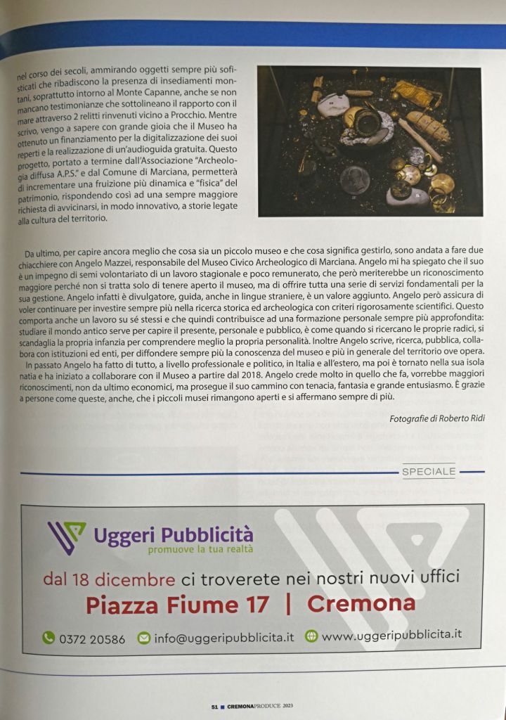 ” Da ultimo, per capire ancora meglio che cosa sia un piccolo museo e che cosa significa gestirlo, sono andata a fare due chiacchiere con Angelo Mazzei, responsabile del Museo Civico Archeologico di Marciana. Angelo mi ha spiegato che il suo è un impegno di semi volontariato di un lavoro stagionale e poco remunerato, che però meriterebbe un riconoscimento maggiore perché non si tratta solo di tenere aperto il museo, ma di offrire tutta una serie di servizi fondamentali per la sua gestione. Angelo infatti è divulgatore, guida, anche in lingue straniere, è un valore aggiunto. Angelo però assicura di voler continuare per investire sempre più nella ricerca storica ed archeologica con criteri rigorosamente scientifici. Questo comporta anche un lavoro su sé stessi e che quindi contribuisce ad una formazione personale sempre più approfondita: studiare il mondo antico serve per capire il presente, personale e pubblico, è come quando si ricercano le proprie radici, si scandaglia la propria infanzia per comprendere meglio la propria personalità. Inoltre Angelo scrive, ricerca, pubblica, collabora con istituzioni ed enti, per diffondere sempre più la conoscenza del museo e più in generale del territorio ove opera.