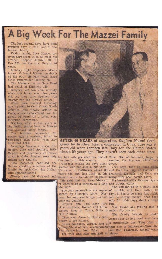 Stephen last saw Jose in Italy when Jose was nine years old. At that time, Stephen was leaving for the United States. When Jose reached traveling age, he went to Central and South America, eventually settling in Cuba, where he has lived for about 36 years as a brick construction contractor. Stephen, after spending a few years in the northern United States, eventually settled in Merced and married Mary Mazzei. When the brothers finally met after nearly half a century, they failed to recognize each other at first.