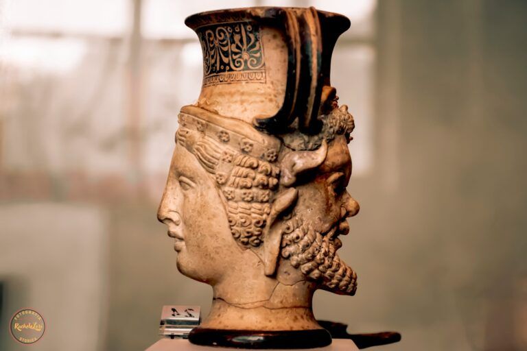 - Un rhyton perfettamente conservato (altezza: 0,19 m), modellato con eleganza. È a doppia faccia: da un lato vi è un Sileno, con un motivo ornamentale a tenia, dall’altro una Baccante. Sul beccuccio del vaso è dipinto un motivo a palmette, che ricorda la tecnica dei rhyta di Vulci.