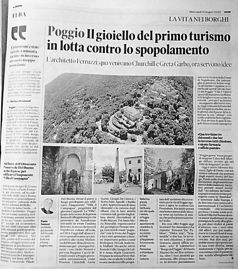 Poggio. Località suggestiva, frazione di Marciana nel cuore verde dell’Elba, fu uno dei primi luoghi a sperimentare il turismo d’élite all’alba del Novecento. Dal fascino unico, per decenni è stata scelta da artisti, nobili e intellettuali che trovavano refrigerio nei suoi boschi e nella quiete delle sue pietre antiche.
