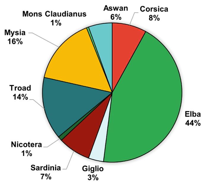 Su un totale di 201 fusti analizzati, 16 sono stati attribuiti alla Corsica, 15 alla Sardegna, 88 all’Elba, 7 al Giglio (in via ipotetica, altrimenti all’Elba), 2 a Nicotera. Considerando le cave anatoliche, 31 fusti sono stati attribuiti alla Misia e 29 alla Troade. Dodici colonne sono state determinate come provenienti da Assuan e una da Mons Claudianus (Fig. 4; Tabella 2).