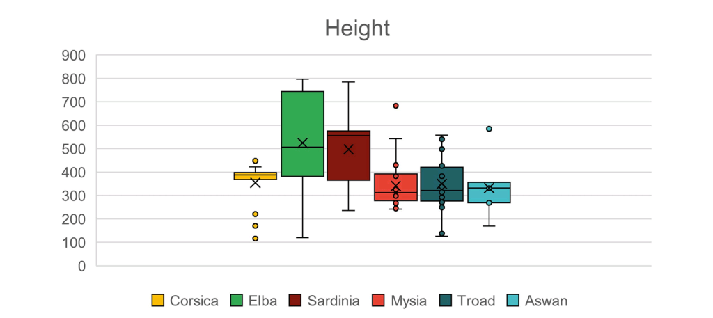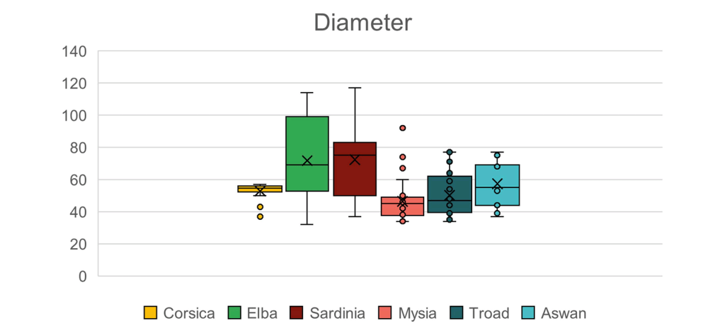 I risultati delle analisi sono stati integrati con le cronologie degli edifici per visualizzare meglio il contributo dei graniti di diversa provenienza nel tempo. Il dataset è stato arricchito con le misure di altezza e diametro di ciascun fusto per consentire analisi comparative basate sulla morfologia.
